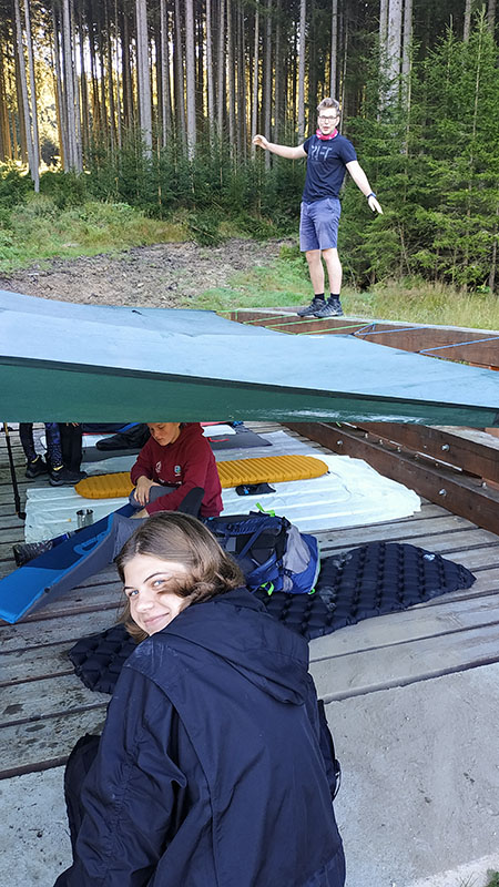Kolem čtvrté ráno se probudím a ten déšť venku je opravdu šílený. Trochu na mě prší, tak se zkusím posunout níž, a jelikož jsem velký strašpytel, ten liják mě opravdu děsí a Lucka leží daleko. Ještě se trochu natlačím na Kubu (ráno se pak ukázalo, že mi Kuba dal v noci omylem facku a já se otočila na Lucku a zboxovala ji – asi řetězová reakce – takže Lucka se radši odsunula někam hodně daleko ode mě).