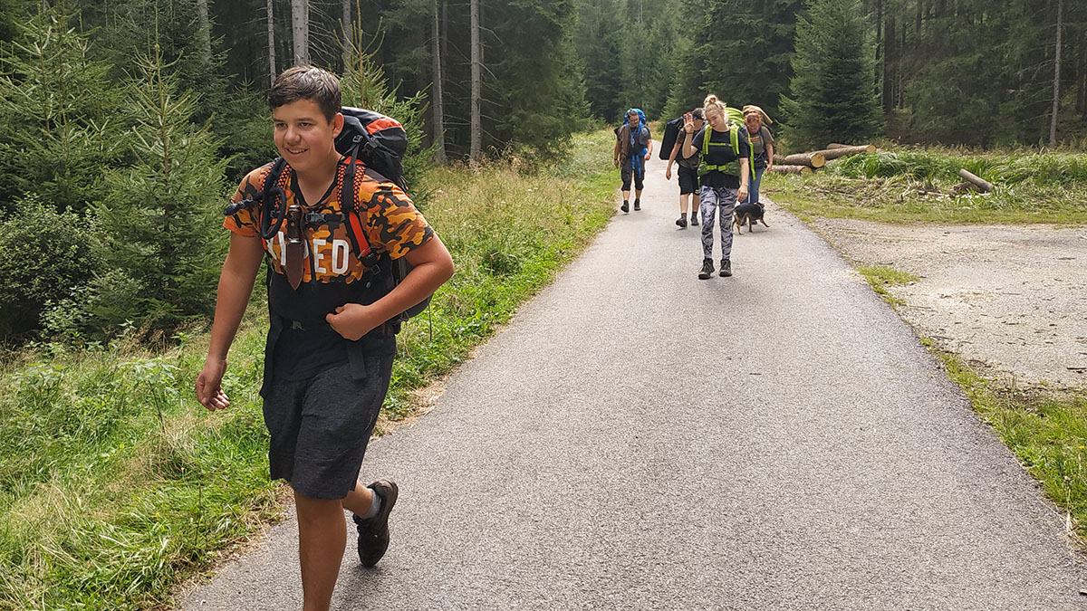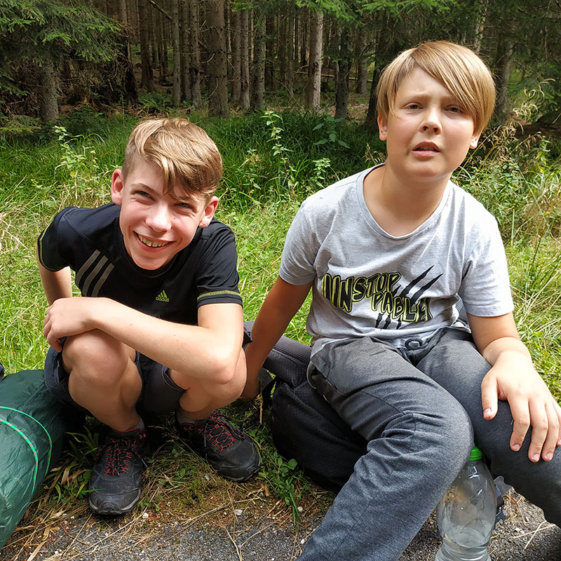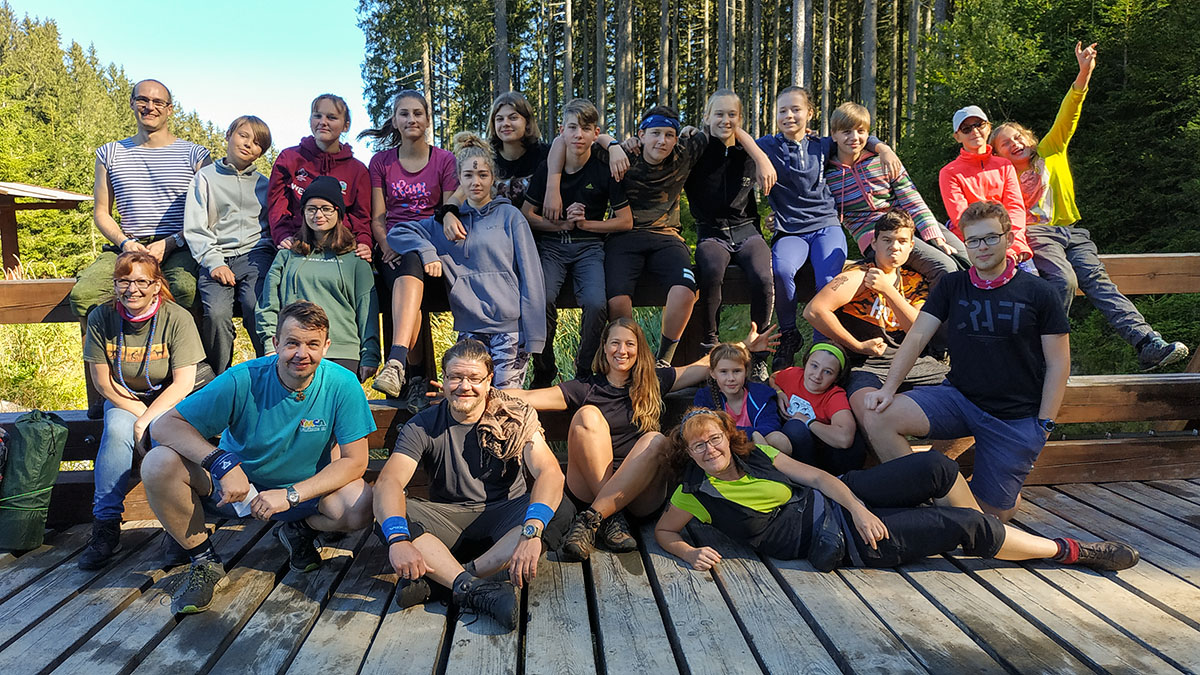 Poslední den nám opravdu dlouho trvá, než se vyhrabeme ze spacáků. Všichni máme mokrou alespoň karimatku, většina i něco dalšího. Vlezu si do mých těžce promočených bot a vydám se s Luckou na snídani. Když jsme všichni najedení, poměrně rychle vše zabalíme a vyrážíme na cestu. Myšok se po cestě zapovídá, takže přejdeme odbočku. Ukazuje se však, že máme štěstí, protože můžeme jít hezky po vrstevnici a nemusíme šlapat moc do kopce. Dojdeme k hospodě, kde si dáváme kofolu a dojídáme zbytky zásob. Pak už jen přejdeme poslední 2 km k autům, rozloučíme se s budějovickou skupinou a vyrážíme na cestu. Naše parta tentokrát jede Žluťákem. Snad nám neupadnou dveře! Po 20 minutách už skřípání, které auto vyluzuje, opravdu nemůžeme vydržet, tak na mobilech zapínáme režim párty a zbytek cesty jedou na plné pecky různé písničky. Na nádraží už na většinu z nás čekají rodiče. Loučíme se. Když se všichni dostatečně naobjímáme, odjíždíme se domů vysprchovat a vyspat s tím, že se ale příští týden zase uvidíme na potáborku.