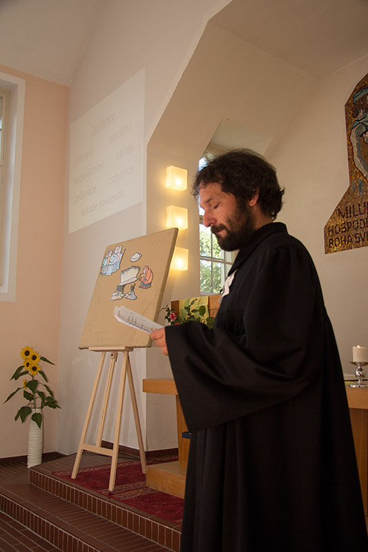 Tak tedy: neděle 11.9 vstávala do krásného a slunečného dne, když se začaly ke kostelu na Jakubu trousit početné skupinky táborníků z různých směrů. Ještě před zahájením bohoslužeb se tahaly lana v parku a je to vždycky závod s časem. Abych řekl pravdu, tak vlastně začíná potáborko už v sobotu stavbou tee-pee a přípravou složitějších lanových překážek. Ondra si letos připravil program na přespávání v týpku. Nezalekl se těžkého tématu a zvolil biblickou knihu Jób. Ten se tedy ničeho nebojí 🙂 Prý se jich v nejsilnější „konfiguraci“ sešlo až 14. Moc si to pochvaloval a i já mám radost, že se jim ta akce vydařila. Bohoslužby připravil jak jinak David Balcar a zvolil nám známý příběh o Rút. Po skončení bohoslužeb přišlo na řadu představování táborů a i my jsme tam měli svůj prostor. Kromě pořiků a hymny (která se setkala s velkou odezvou), jsme sehráli ukázky z ducháče i bojovky. Nejdříve jak Saul neuváženě sám obětoval místo Samuela a tím si přivodil ztrátu království a potom závěrečnou scénu, kdy Lord Paldor napadne krále, jehož skonu zabrání udatný Robert z Lesa. Na závěr jsme místo tradičního hurá pěkně z hluboka zavili Vlčici II 2017, na kterou se už moc těšíme. Po obědě tvořeném vynikajícím guláškem jsme prošli připravené úkoly. Byl jsem přidělen k lukům a bylo tam pekelné horko. Palda v černé košili se rozhodl pomáhat a zanedlouho měl třetí povodňový stav 🙂 Kolem třetí nastal čas se sejít v kostele k závěrečnému rozloučení při kytaře. Je to hezký pocit vidět, do jaké šíře se Ymca za ty roky rozrostla a kolik radosti přináší od těch nejmenších z rodinných táborů po téměř dospěláky z Teenu. Takže ti Ymko držíme palce do další sezóny. Míša rozdávala dvd a kdo tam nebyl, tomu se je budeme snažit doručit. Bohužel se nám letos naprosto záhadně ztratily fotky (vůbec nechápeme, jak k tomu došlo) a tak se omlouváme, že máte na cd jen ty z webu. Lidé se holt dělí na ty, kteří už o data přišli a ty, které to teprve čeká 🙂