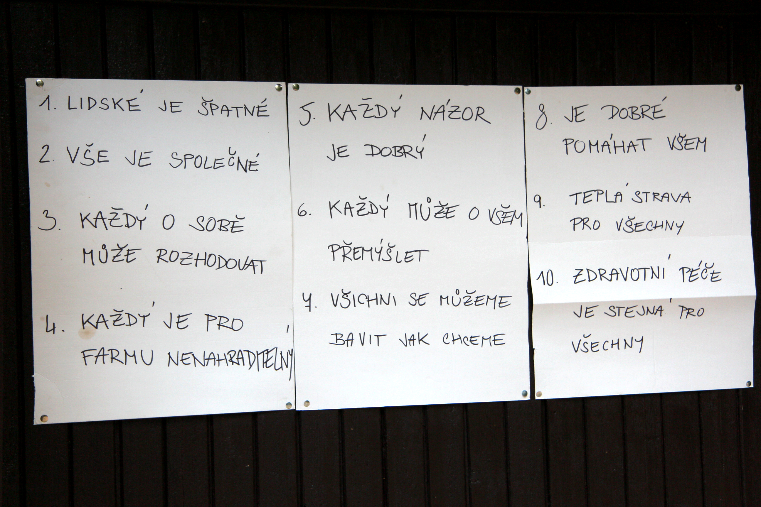 Druhý den začala práce na naší společné farmě. Nejdříve bylo nutné se dohodnout, jak ji vlastně budeme spravovat, kdo co může, co se musí, co se nesmí. Nejvíc nad tím přemýšleli Kuliš, Napoleon a ostatní prasata, protože byla samozřejmě od přírody na přemýšlení nejvíce nadaná. Nakonec jsme dali dohromady pravidla farmy, kterými se budeme všichni společně řídit. Zněla takto.
